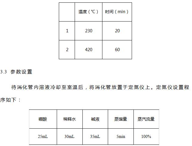 硫酸(分析純),硼酸(分析純),氧化鈉(分析純),溴甲酚綠-甲基紅混合指示劑,催化劑片(3g硫酸鉀和0.2g硫酸銅混合均勻壓片),0.1mol/L鹽酸標(biāo)準(zhǔn)滴定液。