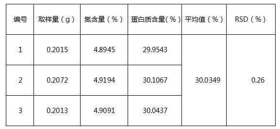 通過數(shù)據(jù)可知,利用全自動(dòng)凱氏定氮法測定蛋黃粉中的蛋白質(zhì)含量平行性良好,且具有操作簡單,安全性高,節(jié)省人力等優(yōu)點(diǎn)。
