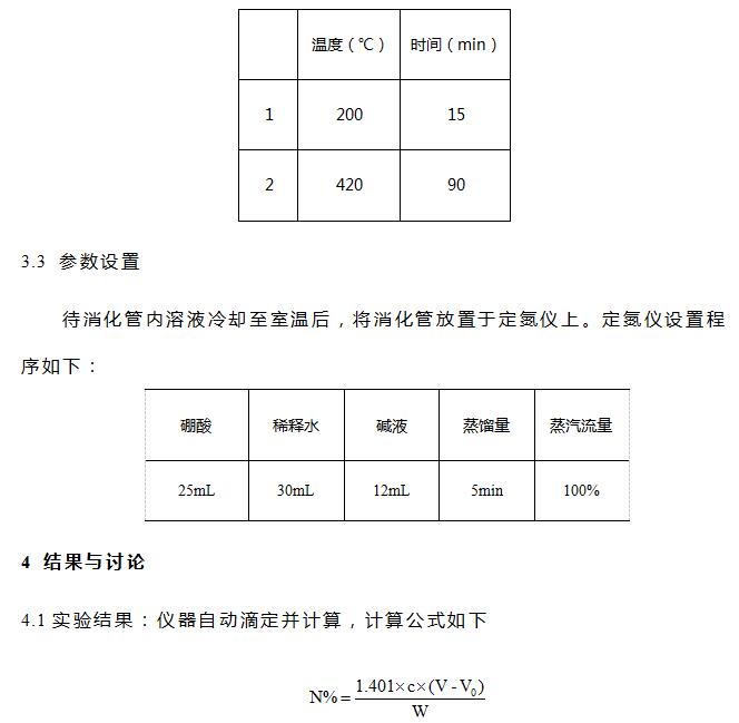 取0.1g(精確至0.1mg)左右的樣品,用無(wú)氮稱(chēng)量紙包住投入消化管中,加硫酸鉀0.3g與30%硫酸銅5滴,再沿瓶壁滴加硫酸3.0ml。