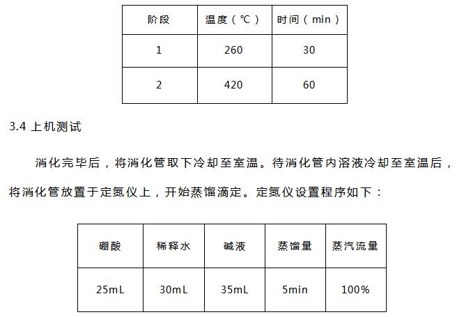硫酸(分析純)、硼酸(分析純)、氫氧化鈉(分析純)、溴甲酚綠-甲基紅混合指示劑、催化劑片(3g硫酸鉀和0.2g硫酸銅混合均勻壓片)、0.1mol/L硫酸標(biāo)準(zhǔn)滴定液等。