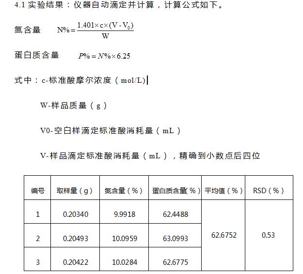 通過數據可知,使用凱氏定氮儀測試海參中蛋白質含量,結果準確,平行性良好。符合《GB 31602-2015 食品安全國家標準 干海參》中的要求。且具有操作簡單,安全性高,節(jié)省人力等優(yōu)點。