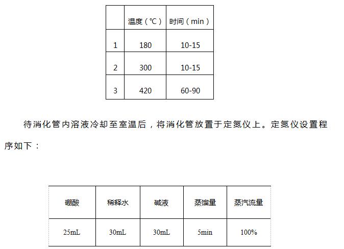 待消化管內溶液冷卻至室溫后,將消化管放置于定氮儀上。定氮儀設置程序如下: