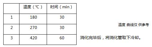 利用石墨消解爐進(jìn)行消解,將消化管放在石墨上,蓋上排氣罩,連接廢氣吸收系統(tǒng),設(shè)定消解溫度參數(shù)如下表: