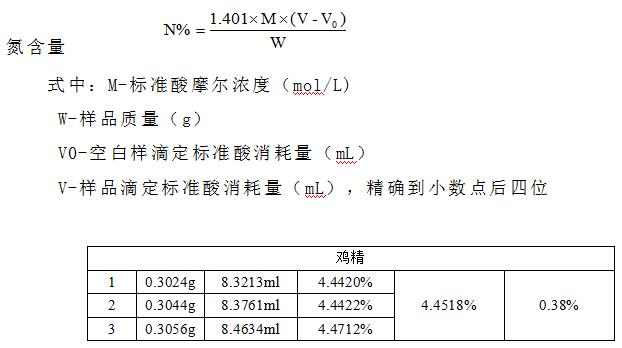 雞精中的有機態(tài)氮在濃硫酸和催化劑的共同作用下,轉(zhuǎn)化為氨態(tài)氮。加堿蒸餾后,用硼酸吸收后,再以鹽酸或硫酸標(biāo)準(zhǔn)滴定液進行滴定。