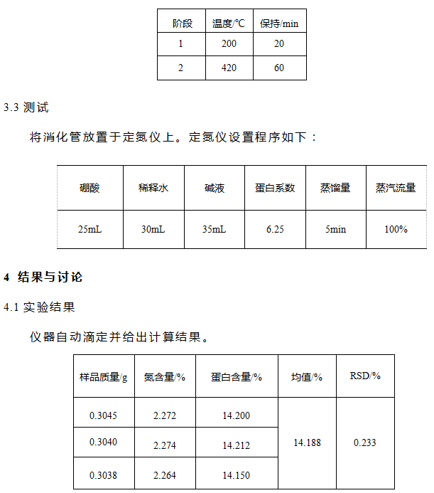 稱取樣品0.3g(精確值0.1mg)左右,加入消化管。加入混合催化劑3g硫酸鉀、0.2g硫酸銅,加入8ml濃硫酸。