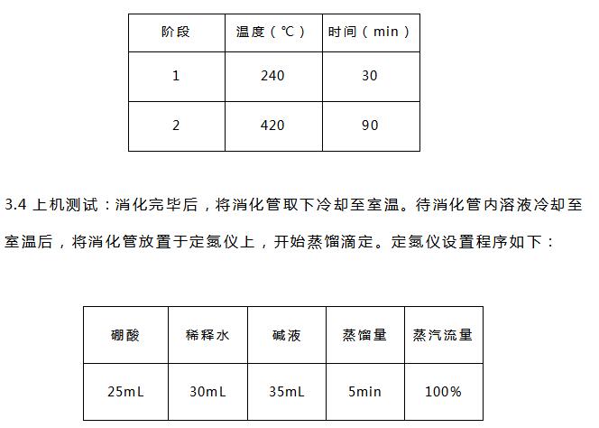 硫酸(分析純)、硼酸(分析純)、氫氧化鈉(分析純)、溴甲酚綠-甲基紅混合指示劑、催化劑片(3g硫酸鉀和0.2g硫酸銅混合均勻壓片)、0.1mol/L硫酸標(biāo)準(zhǔn)滴定液等。