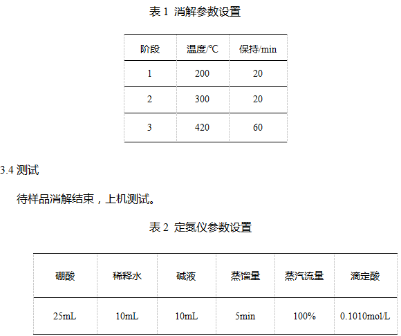 分別精確量取1mL制備好的總氮溶液及2mL非蛋白氮溶液加入消化管中,各加入0.3g硫酸鉀與30%硫酸銅水溶液5滴,再沿瓶壁滴加硫酸2.0ml。