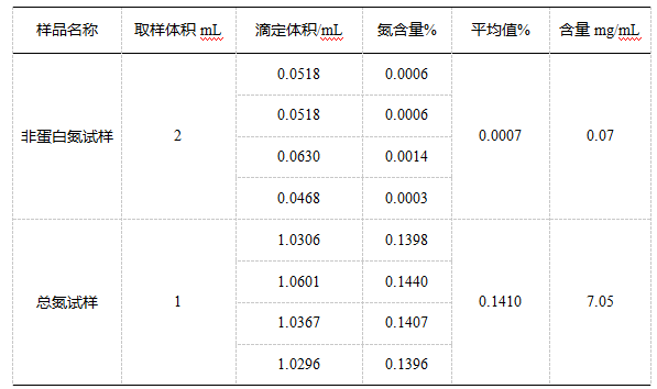 蛋白氮含量=(7.05-0.07)×6.25=43.625mg/mL
