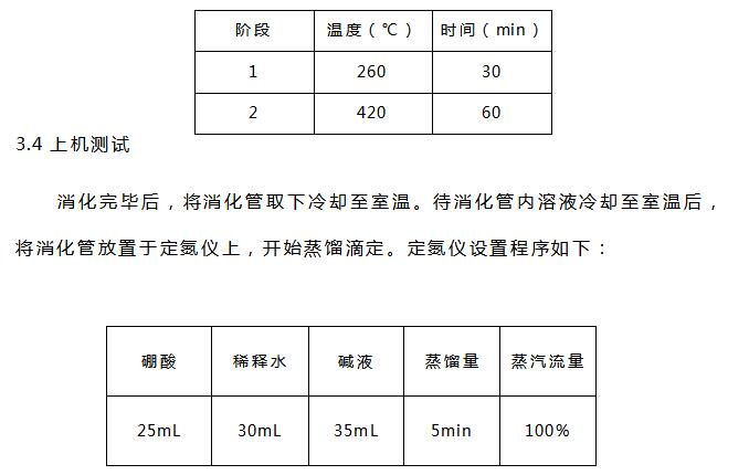 硫酸(分析純)、硼酸(分析純)、氫氧化鈉(分析純)、溴甲酚綠-甲基紅混合指示劑、催化劑片(3g硫酸鉀和0.2g硫酸銅混合均勻壓片)、0.1mol/L硫酸標準滴定液等。