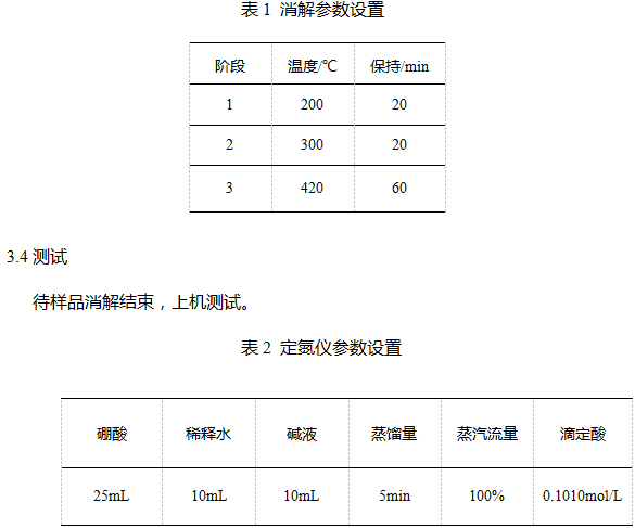 分別精確量取1mL制備好的總氮溶液及1mL非蛋白氮溶液加入消化管中,各加入0.3g硫酸鉀與30%硫酸銅水溶液5滴,再沿瓶壁滴加硫酸2.0ml。