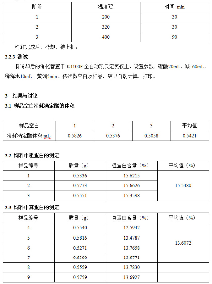 將冷卻后的消化管置于K1100F全自動(dòng)凱氏定氮儀上,設(shè)置參數(shù):硼酸20mL,堿 60mL,稀釋水10mL,蒸餾5min。依次做空白及樣品,結(jié)果自動(dòng)計(jì)算,打印。