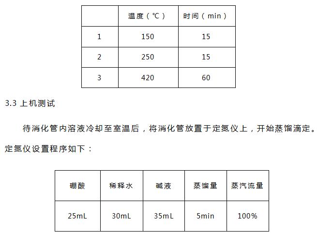 硫酸(分析純)、硼酸(分析純)、氫氧化鈉(分析純)、溴甲酚綠-甲基紅混合指示劑、催化劑片(3g硫酸鉀和0.2g硫酸銅混合均勻壓片)、0.1mol/L硫酸標(biāo)準(zhǔn)滴定液等。
