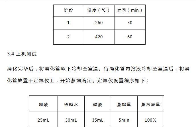 稱(chēng)取上述制備好的樣品0.3g(精確至0.1mg),加一片催化劑片(或硫酸鉀3g與硫酸銅0.2g),再加硫酸10mL。同時(shí)做空白實(shí)驗(yàn)。