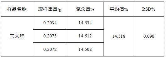 測試結(jié)果顯示本次測試的氮含量均值為14.518%,滿足藥典中其氮含量13.1%~17.0%的要求。且RSD值為0.096%,重復(fù)性良好。