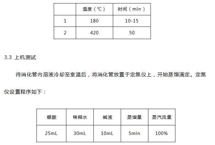 硫酸(分析純)、硼酸(分析純)、氫氧化鈉(分析純)、溴甲酚綠-甲基紅混合指示劑、硫酸鉀(分析純)、硫酸銅(分析純)、0.1mol/L硫酸標(biāo)準(zhǔn)滴定液等。