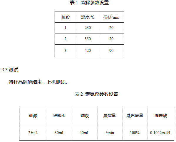 稱取混合均勻的樣品0.3g左右(精確至0.1mg)加入消化管中,然后加入4g混合催化劑,再沿消化管壁加入濃硫酸10ml。
