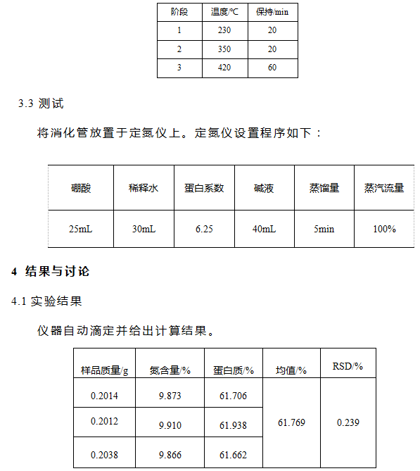 稱取樣品0.2g(精確值0.1mg)左右,加入消化管。加入混合催化劑3g硫酸鉀、0.2g硫酸銅,加入10ml濃硫酸。