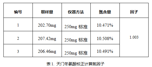 待TCD檢測器溫度升至59℃左右開始進行測定。首先加氧空燒兩三次,排除燃燒管內殘留O2。開始測試,選擇250mg標準,天門冬氨酸校正計算氮因子,而后得到奶粉樣品中蛋白質含量。