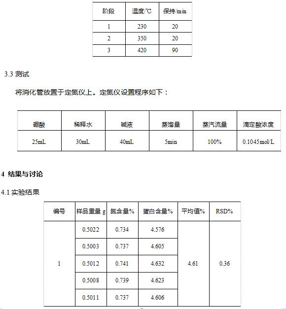 以上數(shù)據(jù)顯示,使用K1100F凱氏定氮儀測定板栗中的蛋白質(zhì)所得結(jié)果誤差符合《GB 5009.5-2016 食品安全國家標(biāo)準(zhǔn) 食品中蛋白質(zhì)的測定》標(biāo)準(zhǔn)要求的兩個測定值的絕對差值不得超過算術(shù)平均值的10%。