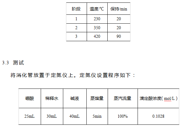 硫酸(分析純),20g/L硼酸溶液,溴甲酚綠-甲基紅混合指示劑,40%氫氧化鈉,混合催化劑壓片(3gK2SO4、0.2gCuSO4),0.1mol/L硫酸標(biāo)準(zhǔn)滴定液。