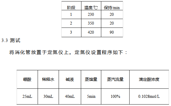 硫酸(分析純),20g/L硼酸溶液,溴甲酚綠-甲基紅混合指示劑,40%氫氧化鈉,混合催化劑壓片(3gK2SO4、0.2gCuSO4),0.1mol/L硫酸標準滴定液。