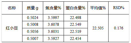 以上數(shù)據(jù)顯示,使用K1100F凱氏定氮儀測定紅小豆中的蛋白質(zhì)含量,所得結(jié)果誤差符合《GB 5009.5-2016 食品安全國家標準 食品中蛋白質(zhì)含量檢測》標準要求的兩個測定值的絕對差值不得超過算術(shù)平均值的10%。