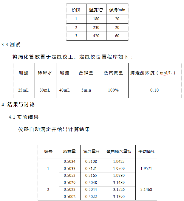 稱取樣品0.5g(精確值0.1mg)左右,加入消化管。加入混合催化劑3gK2SO4、0.2gCuSO4,加入10ml濃硫酸。