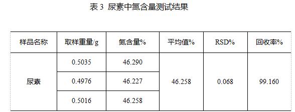 測(cè)試結(jié)果顯示本次測(cè)試的氮含量均值為46.258%,回收率為99.160%。且重復(fù)性滿足《GB/T 2441.1-2008 尿素的測(cè)定方法 第1部分:總氮含量》中平行測(cè)試結(jié)果絕對(duì)差值不大于0.1%的要求。