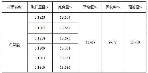 通過實(shí)驗(yàn)結(jié)果可以看到,使用此方法測(cè)試的色氨酸氮含量回收率可以達(dá)到99.78%,回收率較高。