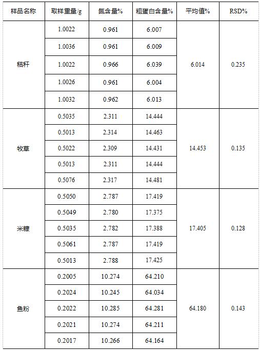 樣品數(shù)據(jù)重復(fù)性符合國(guó)標(biāo)《GB/T 6432-2018 飼料中粗蛋白的測(cè)定 凱氏定氮法》中的測(cè)試精密度的要求,且RSD均小于0.5%,重復(fù)性良好。