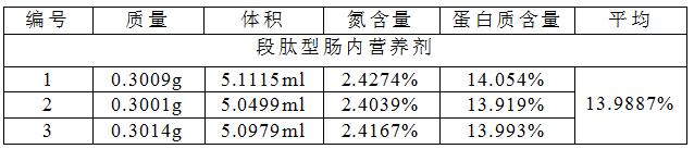 短肽型腸內(nèi)營養(yǎng)劑中的有機態(tài)氮在濃硫酸和催化劑的共同作用下,轉(zhuǎn)化為氨態(tài)氮。加堿蒸餾后,用硼酸吸收后,再以硫酸標準滴定液進行滴定。