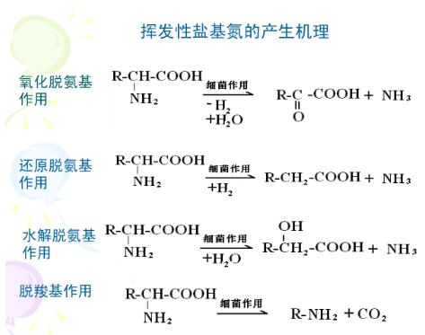 蛋白質(zhì)在酶和細(xì)菌的作用下分解后產(chǎn)生堿性含氮物質(zhì),有氨、伯胺、仲胺等,此類物質(zhì)具有揮發(fā)性,測定時使用高氯酸溶液浸提,在堿性溶液中蒸餾出后,用硼酸吸收液吸收,再以標(biāo)準(zhǔn)滴定酸溶液滴定計算含量。