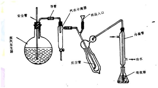 蒸餾:預(yù)先將盛有10ml吸收液并加有5-6滴混合指示液的錐形瓶置于冷凝管下端,并使其下端插入錐形瓶內(nèi)吸收的液面下,精密吸取5ml上述樣品濾液于蒸餾器反應(yīng)室內(nèi),加5ml 1%氧化鎂混懸液,迅速蓋塞,并加水以防漏氣,通入蒸汽,待蒸汽充滿蒸餾器內(nèi)時即關(guān)閉蒸汽出口管,由冷并行管出現(xiàn)第一滴冷凝水開始計時,蒸餾5min即停止。