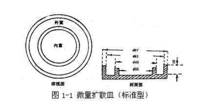 擴散皿(標(biāo)準(zhǔn)型):玻璃質(zhì),內(nèi)外室總直徑61mm,內(nèi)室直徑35mm;外室深度10mm,內(nèi)室深度5mm;外室壁存3mm,內(nèi)室壁存2.5mm,回壁紗厚玻璃蓋,如圖所示,其他型號亦可用。