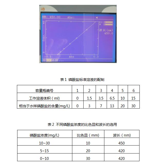 1.4.1工作曲線的繪制:根據(jù)待測水樣的磷酸鹽含量范圍,按照表1分別取0、1.5、3.5、6.5、10、15ml的磷酸鹽工作溶液,注入到50ml容量瓶中,用除鹽水稀釋至刻度,將配制好的磷酸鹽標準溶液,各加入5ml鉬釩酸顯色溶液,搖勻,放置2min。根據(jù)水樣磷酸鹽的含量,按表2選擇合適的比色皿和波長,以試劑空白作參比,分別測定顯色后的磷酸鹽標準溶液吸光度,并繪制工作曲線。