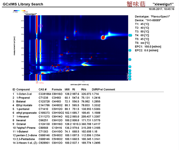 使用G.A.S.公司FlavourSpec®風(fēng)味分析儀,在無需樣品前處理前提下,經(jīng)孵化頂空進(jìn)樣后可快速檢測食用菌揮發(fā)性有機(jī)物,儀器配備的強(qiáng)大功能軟件可給出樣品的氣相離子遷移譜圖及揮發(fā)性有機(jī)物的指紋譜圖,通過揮發(fā)性有機(jī)物的氣相離子遷移譜圖,我們可以:
