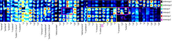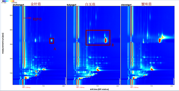結(jié)論:經(jīng)FlavourSpec®快速分析,可快速識別金針菇、白玉菇及蟹味菇中揮發(fā)性有機(jī)物的區(qū)別與差異,從指紋譜圖中可知金針菇與白玉菇、蟹味菇的差異很大,特征信號峰非常明顯;而屬于同類不同變種的白玉菇和蟹味菇在揮發(fā)性有機(jī)物上也存在差異。
