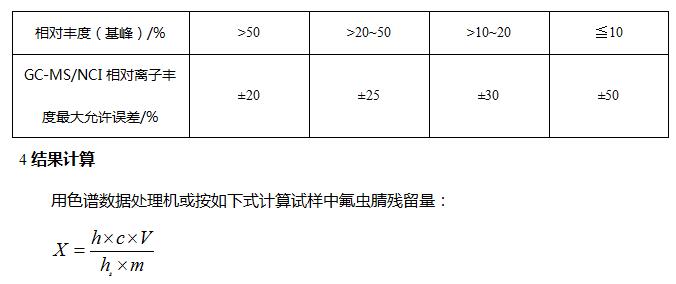 表1 使用定性氣相色譜-質(zhì)譜時相對離子豐度最大容許誤差