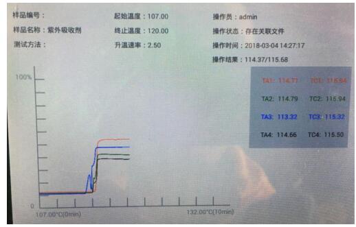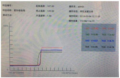 紫外線吸收劑是目前應(yīng)用最廣的一類光穩(wěn)定劑,按其結(jié)構(gòu)分為水楊酸酯類、二苯甲酮類、苯丙三唑類、取代丙烯腈類等。苯丙三唑類紫外線吸收劑能強(qiáng)烈吸收波長為270~380nm的紫外線,化學(xué)穩(wěn)定性好,揮發(fā)性極小。與聚烯烴的相容相好,特別適用于聚乙烯和聚丙烯。該品具有優(yōu)良的耐熱升華性,耐洗滌性、耐氣體褪色性和機(jī)械性能保持性。與抗氧化劑并用為顯著的協(xié)同效應(yīng)。要改善制品的熱氧穩(wěn)定性。測定苯丙三唑類紫外線吸收劑的熔點(diǎn)對于鑒定其純度具有很大價值。本文選擇兩種升溫速率進(jìn)行測試,實(shí)驗(yàn)證明,1℃/min的速率結(jié)果更平行。