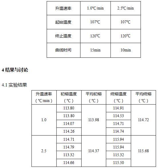 樣品熔化過程中易分層,且熔化后樣品量減少,分析原因可能出現(xiàn)升華的現(xiàn)象,所以在實(shí)驗(yàn)時選擇了兩種升溫速率:1.0℃/min和2.5℃/min。實(shí)驗(yàn)結(jié)果和圖譜證明在1.0℃/min時的結(jié)果平行性更好,圖譜更加趨于一致。所以建議升溫速率1.0℃/min。