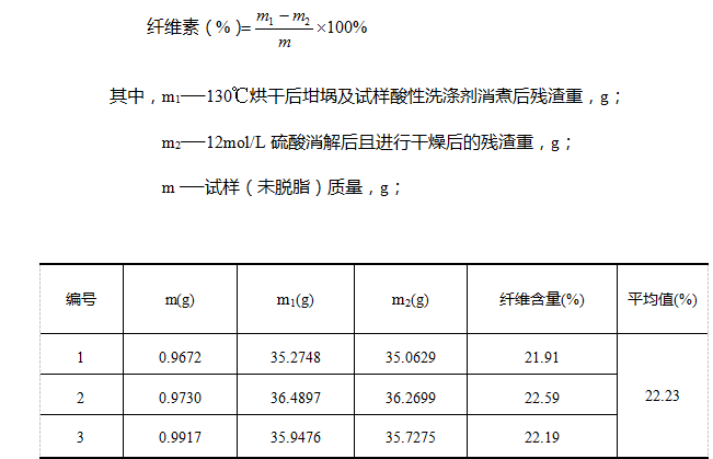 根據(jù)Van Soest方法結(jié)合海能F800纖維測(cè)定儀測(cè)定飼料中纖維素的含量原理如下:飼料經(jīng)酸性洗滌劑的消煮后,得到殘?jiān)煞譃槔w維素、木質(zhì)素和硅酸鹽;樣品再經(jīng)12mol/L硫酸常溫下消解,得到殘?jiān)煞譃槟举|(zhì)素和硅酸鹽;兩過(guò)程殘?jiān)亓恐罴礊槔w維素的重量,從而與樣品質(zhì)量相比得出纖維素含量值。
