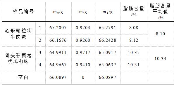 由表中數(shù)據(jù)可知,采用SOX406脂肪測定儀測試的心形顆粒狀牛肉味和骨頭形顆粒狀雞肉味幼犬犬糧樣品兩個平行樣數(shù)據(jù)的重復性符合國標GB/T6433-2006標準,即心形顆粒狀牛肉味和骨頭形顆粒狀雞肉味幼犬犬糧樣品的脂肪含量分別為8.10%和10.33%。