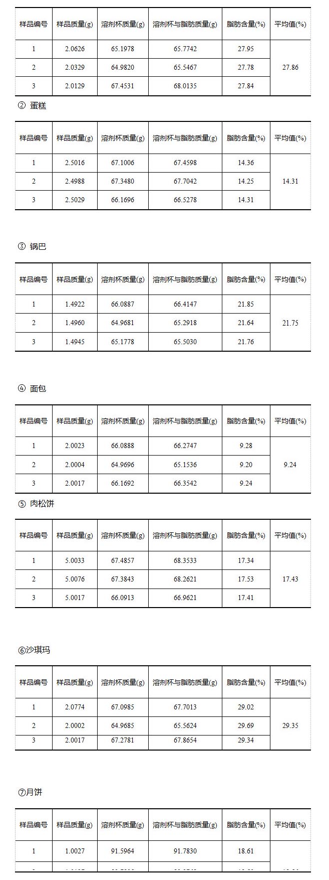 《GB 5009.6-2016食品安全國家標準 食品中脂肪的測定》中對于精密度規(guī)定:在重復(fù)性條件下獲得的兩次獨立測定結(jié)果的絕對差值不得超過算術(shù)平均值的10%。實驗各樣品三次獨立測定結(jié)果絕對差值均未超過算術(shù)平均值的10%,符合標準要求。