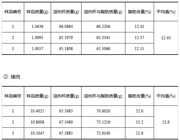 由實驗結(jié)果可知,肉與肉制品游離脂肪含量較高,萃取時間根據(jù)樣品質(zhì)量和脂肪含量增多相應(yīng)加長。