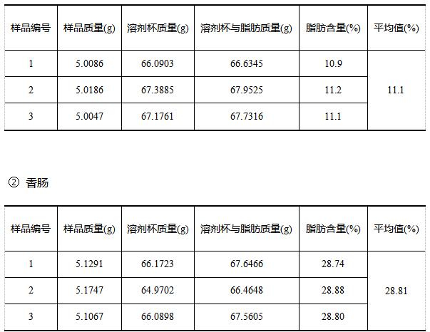 《GB/T 9695.7-2008 肉與肉制品 總脂肪含量測定》中重復性規(guī)定:同一分析者在同一實驗室、采用相同的方法和相同的儀器、在短時間間隔內(nèi)對同一樣品獨立測定兩次。兩次測試結(jié)果的絕對差值不超過0.5%。實驗各樣品三次獨立測定結(jié)果符合標準要求。