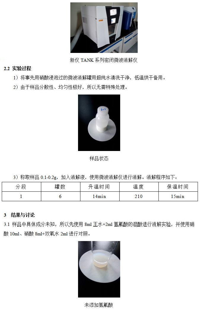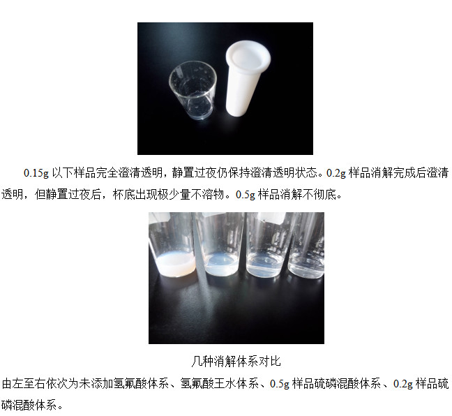 以上仍呈現(xiàn)乳濁狀態(tài)。而添加氫氟酸的消解體系,樣品靜置半小時(shí)后出現(xiàn)沉淀現(xiàn)象。所以,判定樣品中二氧化硅或者硅酸鹽的含量比較高。