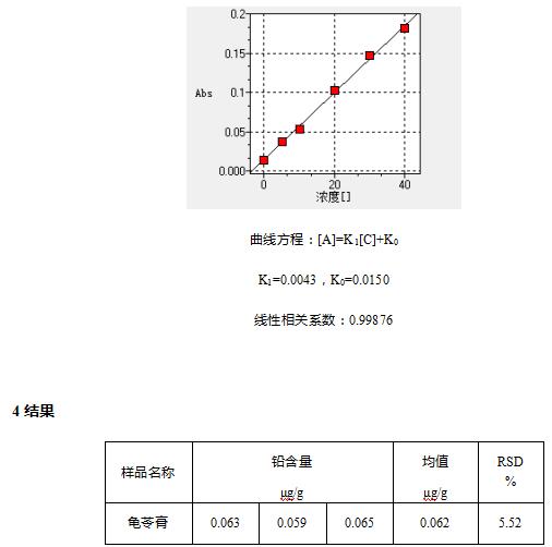 龜苓膏樣品中鉛含量為0.062μg/g,測量結(jié)果的RSD=5.52%,平行性良好。