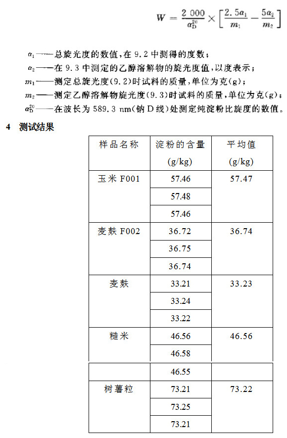 本方法不適用于含有在分析過程中具有光學(xué)活性,且不溶于 40%乙醇的淀粉以外的其他物質(zhì)的產(chǎn)品,如馬鈴薯漿,甜菜的絲、葉、根、冠,酵母,大豆產(chǎn)品,羽扇豆、富含葡萄糖的產(chǎn)品,如菊首根和菊芋等,此時(shí)可用酶法測(cè)定淀粉含量,否者測(cè)定淀粉含量偏高或偏低。