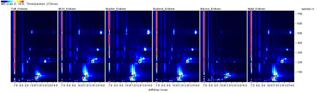 我們可以截取譜圖中差異明顯的部分進(jìn)行研究(下圖),從其中找到隨時(shí)間延長,揮發(fā)性物質(zhì)變化最為明顯、靈敏的部分,作為樣品新鮮程度的判定標(biāo)準(zhǔn)。根據(jù)內(nèi)置的NIST氣相色譜保留時(shí)間及離子遷移譜數(shù)據(jù)庫,定性該物質(zhì)。