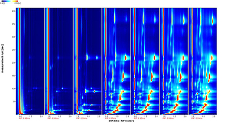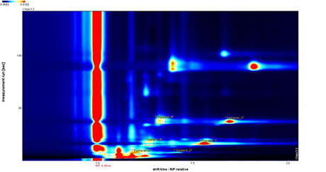 氣相色譜和離子遷移譜儀兩種技術(shù)的分離效果清晰可見。一個(gè)信號(hào)由一個(gè)或多個(gè)向量配對(離子遷移漂移時(shí)間和保留指數(shù))決定,這是物質(zhì)定性的獨(dú)特方法。儀器的LAV軟件可以實(shí)現(xiàn)數(shù)據(jù)處理并以三維形式表示測量結(jié)果。在疊加模式下作為差異地形圖,可以很容易地比較測量結(jié)果。且每個(gè)分離維度都可利用氣相色譜儀(GC)監(jiān)控或離子遷移譜儀(IMS)監(jiān)控,它們能夠以色譜或離子遷移譜的形式給出一維數(shù)據(jù)圖。